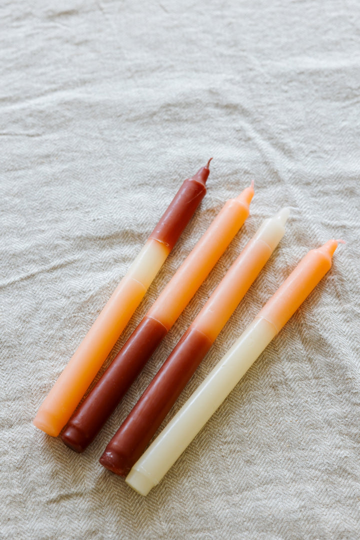 Een set van vier dinerkaarsen in nude kleuren - van zand tot zacht roze.