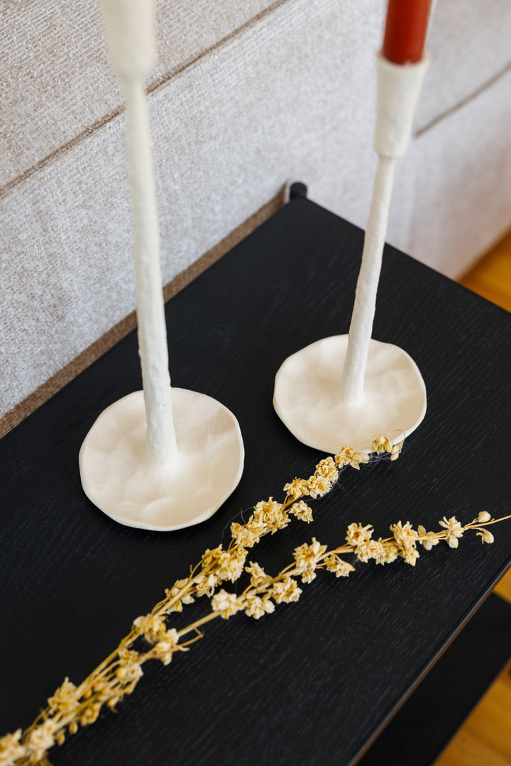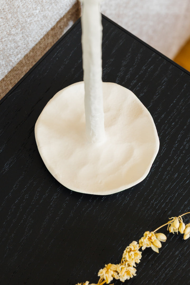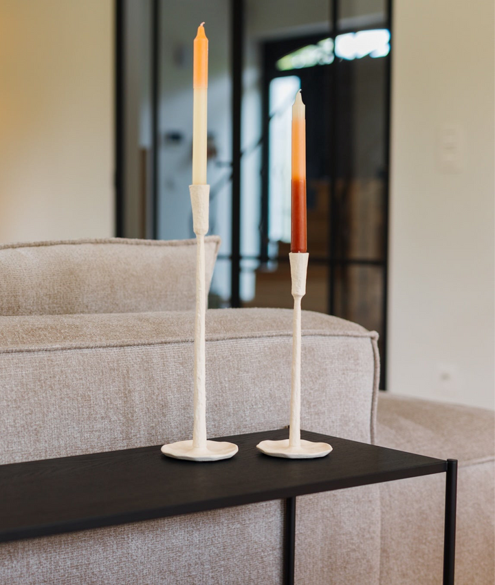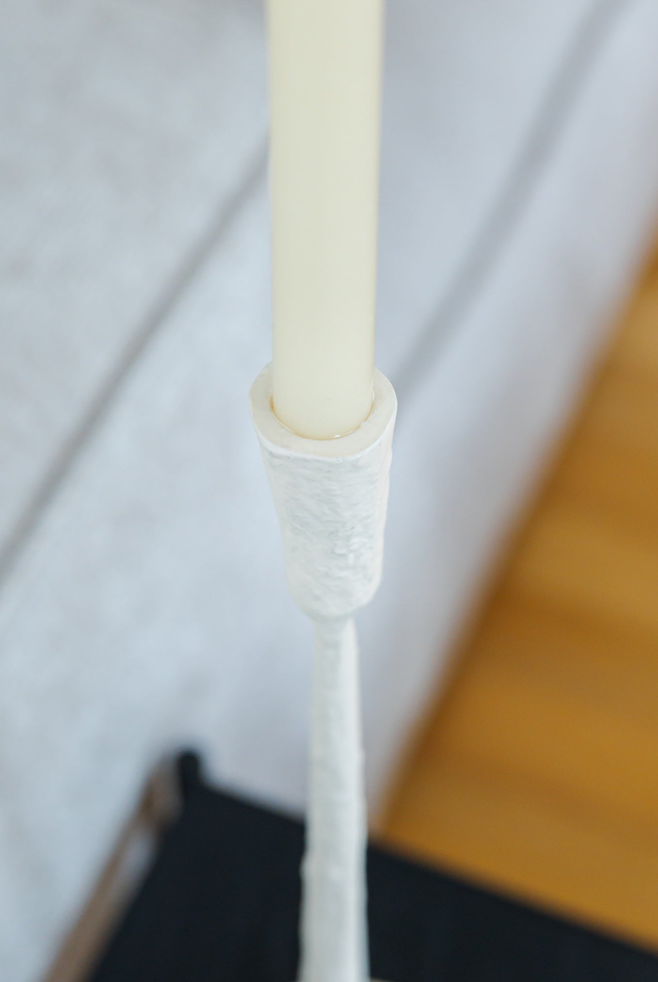 Een slanke kandelaar in een zachte crémetint dat zorgt voor een rustig accent op tafel of in een open kast.