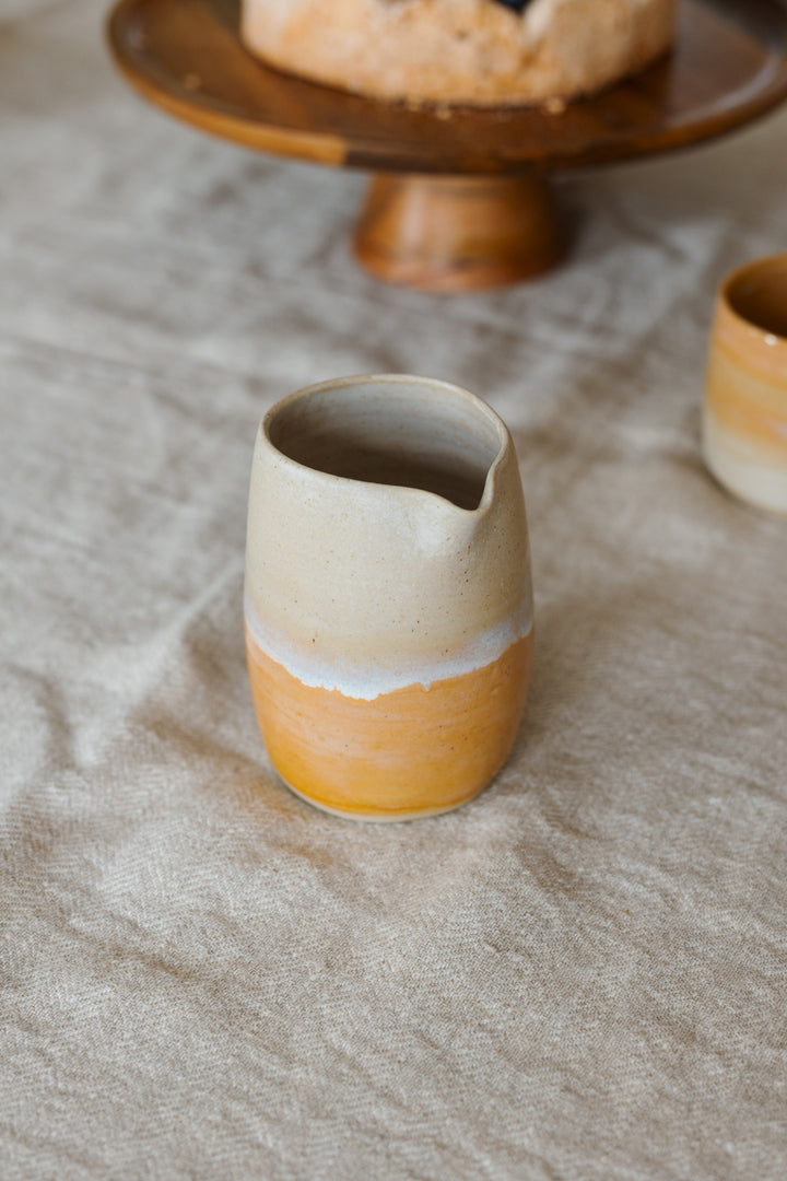 Handgemaakt keramiek van Daphsatelyay. Dit kannetje is ontworpen voor het kleine gebaar: een scheut melk bij je koffie, haverdrank bij de thee, vinaigrette aan tafel of sojasaus naast je sushi. Subtiel van vorm, bedoeld om te gebruiken ~ elke dag opnieuw.