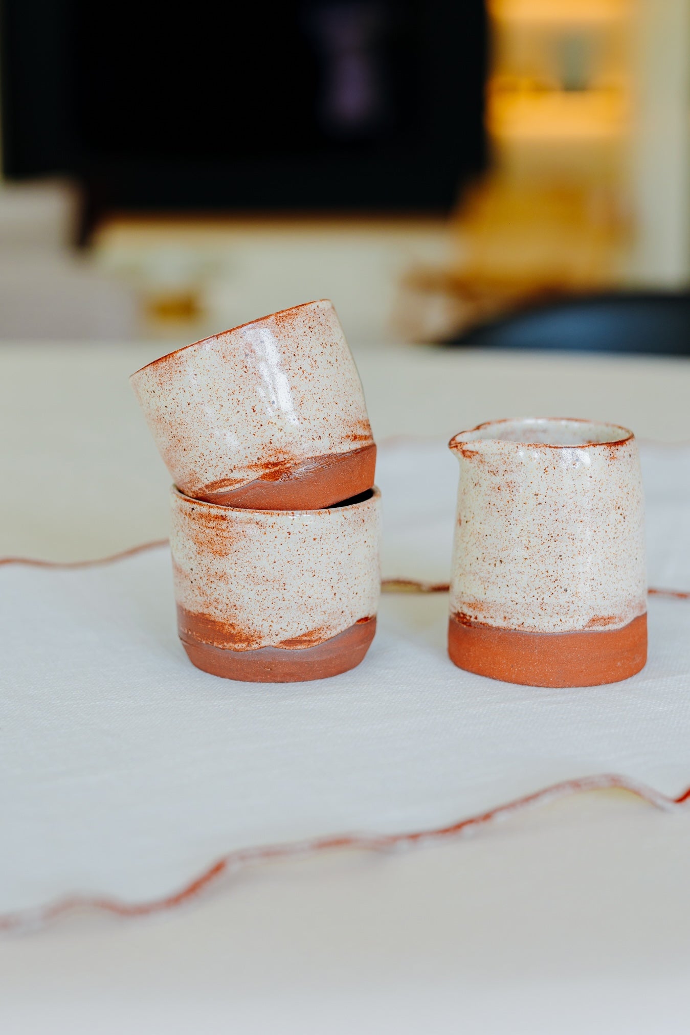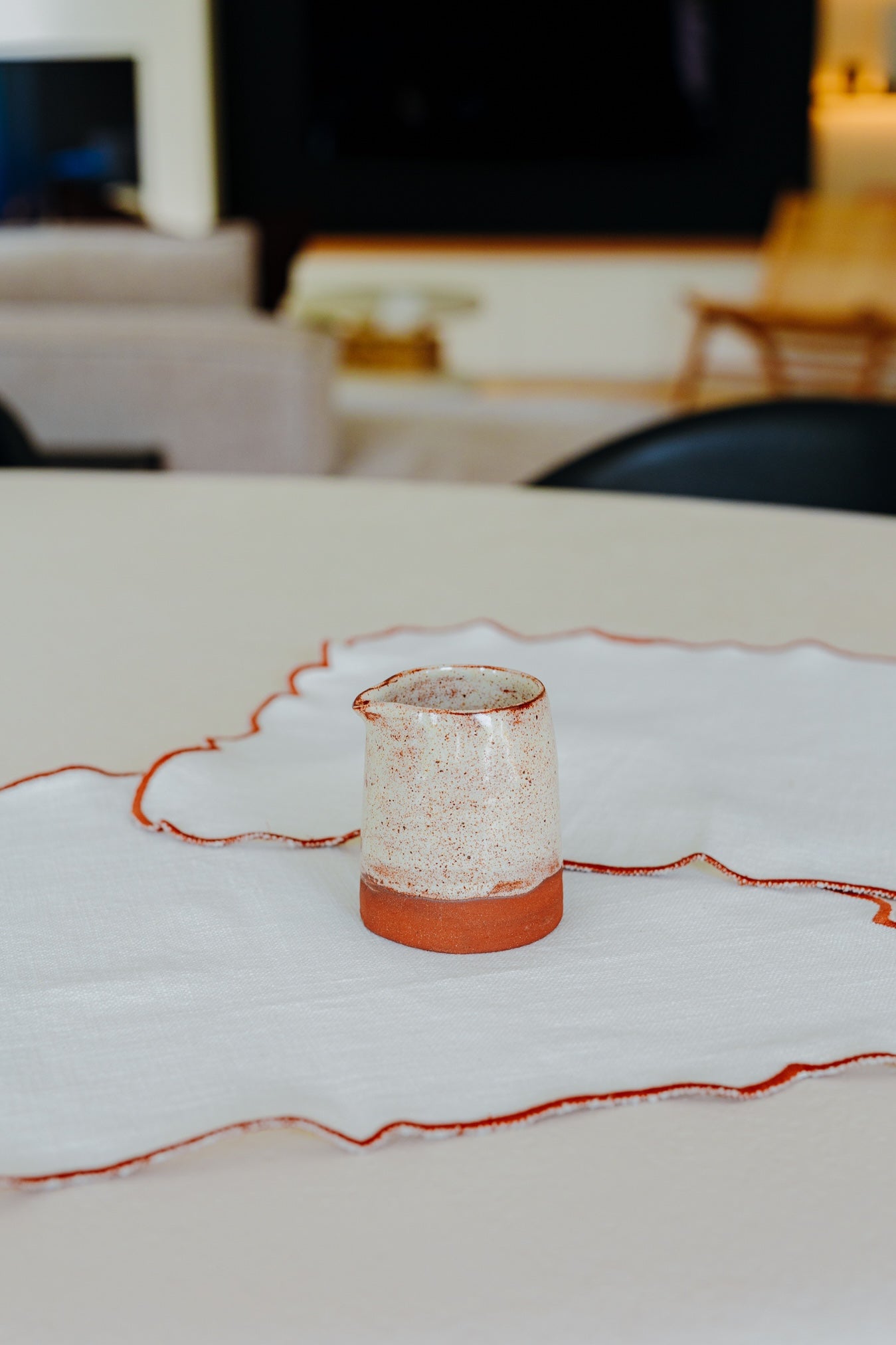 Met de hand gevormd uit keramiek en afgewerkt met warme rode accenten. Perfect voor melk, room, sojasaus of een kleine dressing aan tafel. Zacht glazuur, natuurlijke vorm; elke keer net even anders. Een subtiel kleuraccent dat warmte brengt in elk servies.
