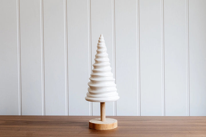 Onze witte keramische kerstboom met houten stam is het perfecte middelpunt voor jouw kerstdecor. De stam en keramische top zijn los van elkaar te gebruiken, waardoor je de boom eenvoudig kunt stylen zoals jij dat wilt. Op de schouw, in een kerststuk of als subtiele eyecatcher op tafel; dit ornament brengt direct een vleugje feestelijke charme in huis.