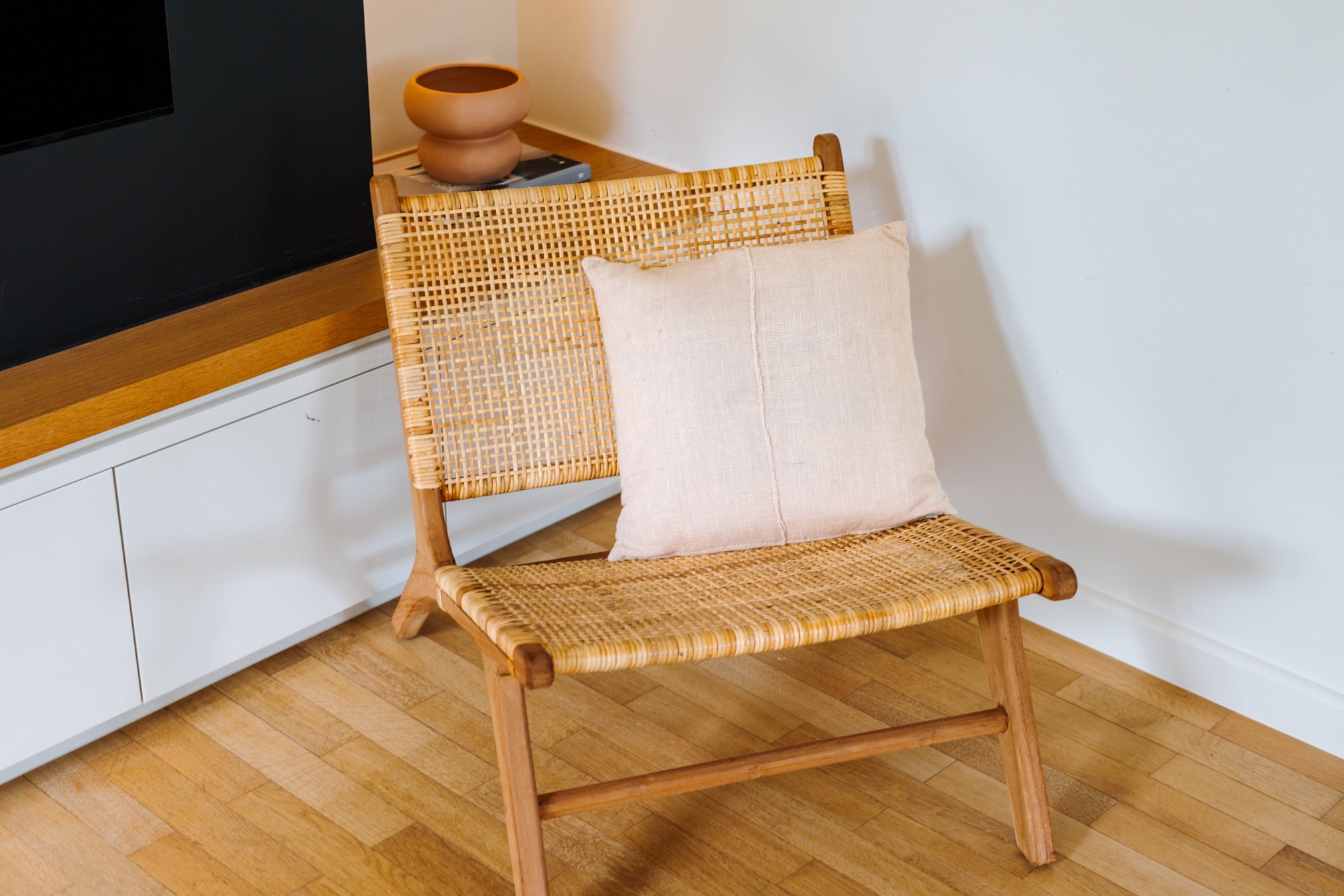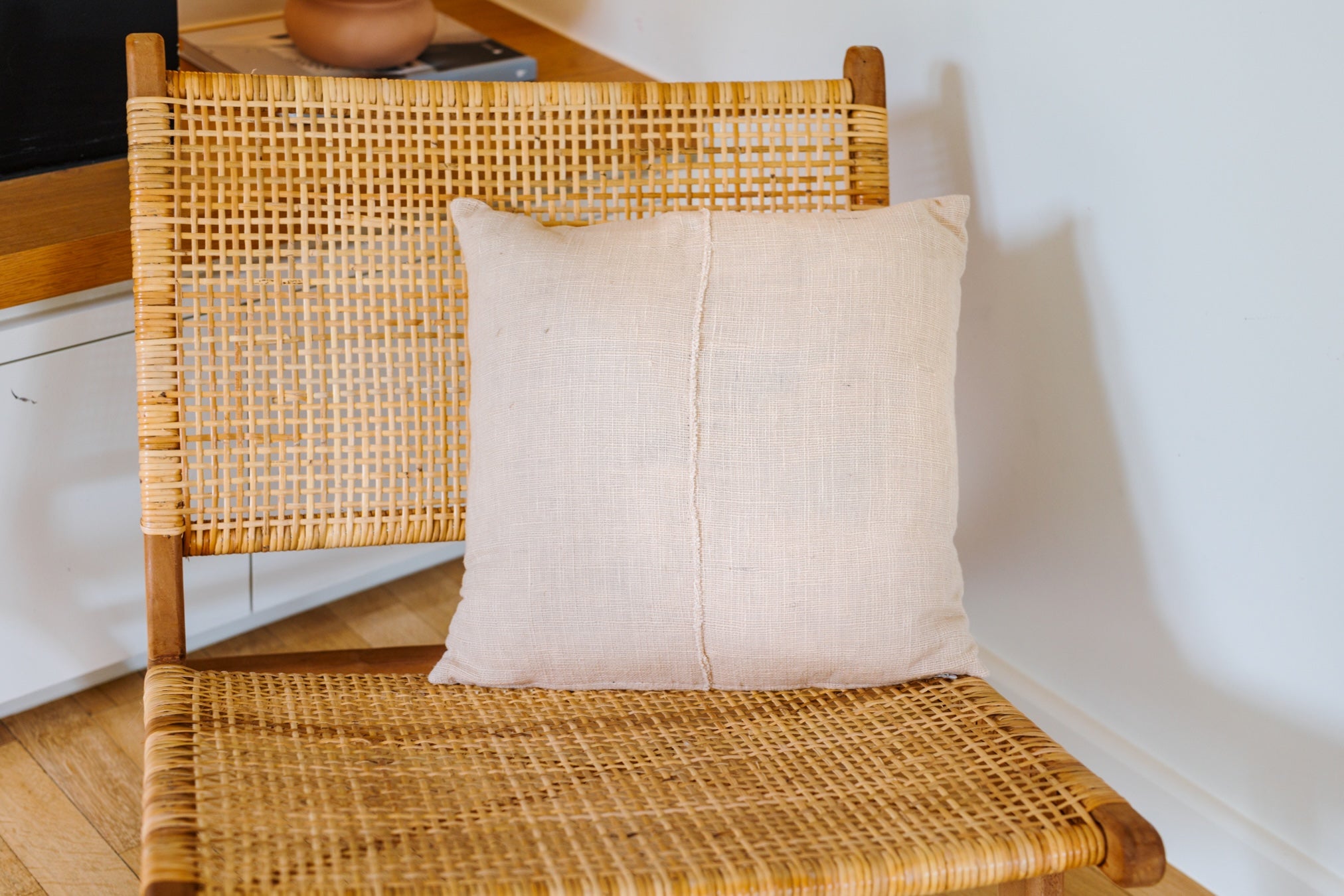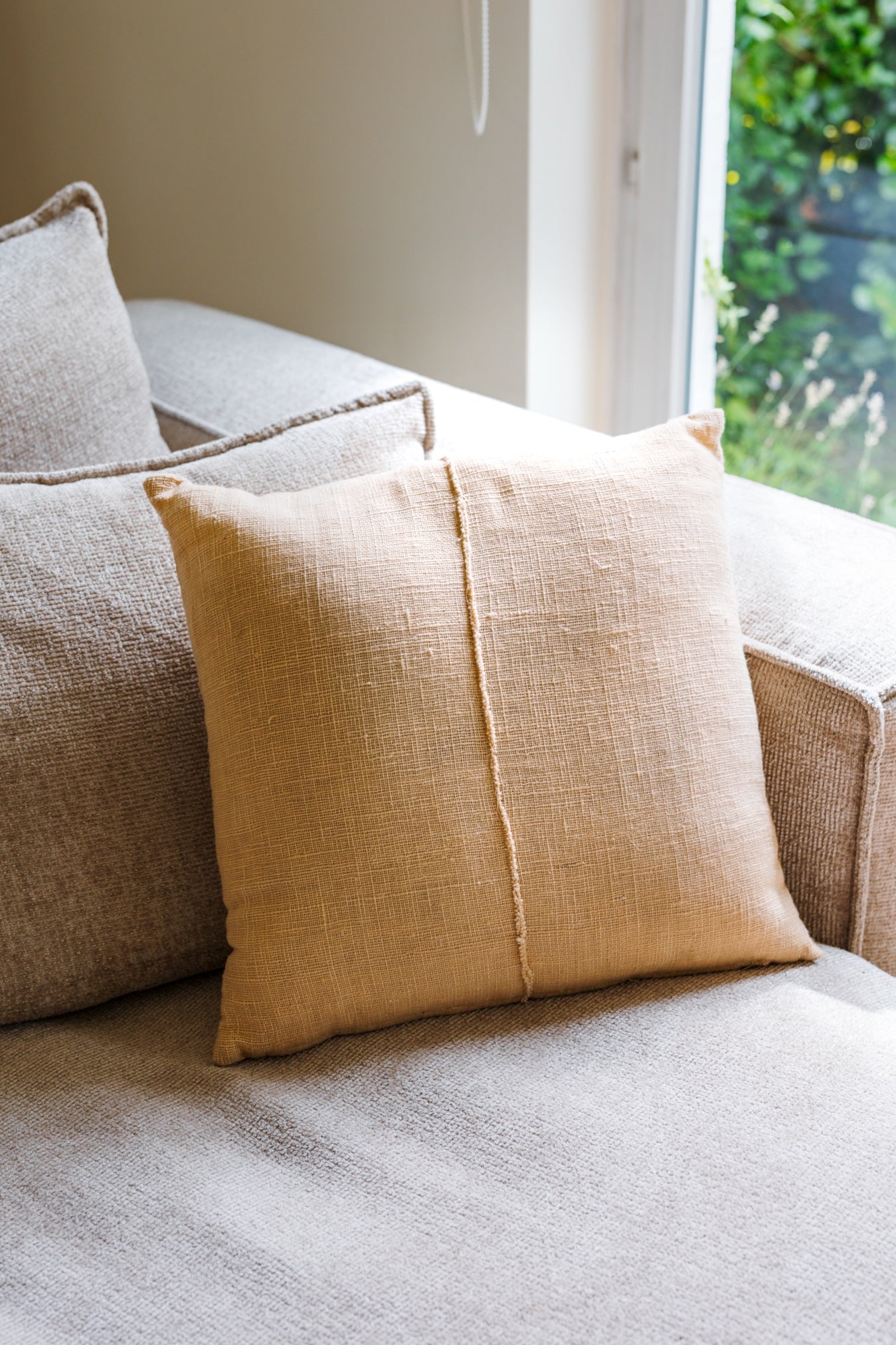 Een kussen in een natuurlijke tint en rustige stof, ontworpen om moeiteloos op te gaan in elk interieur.