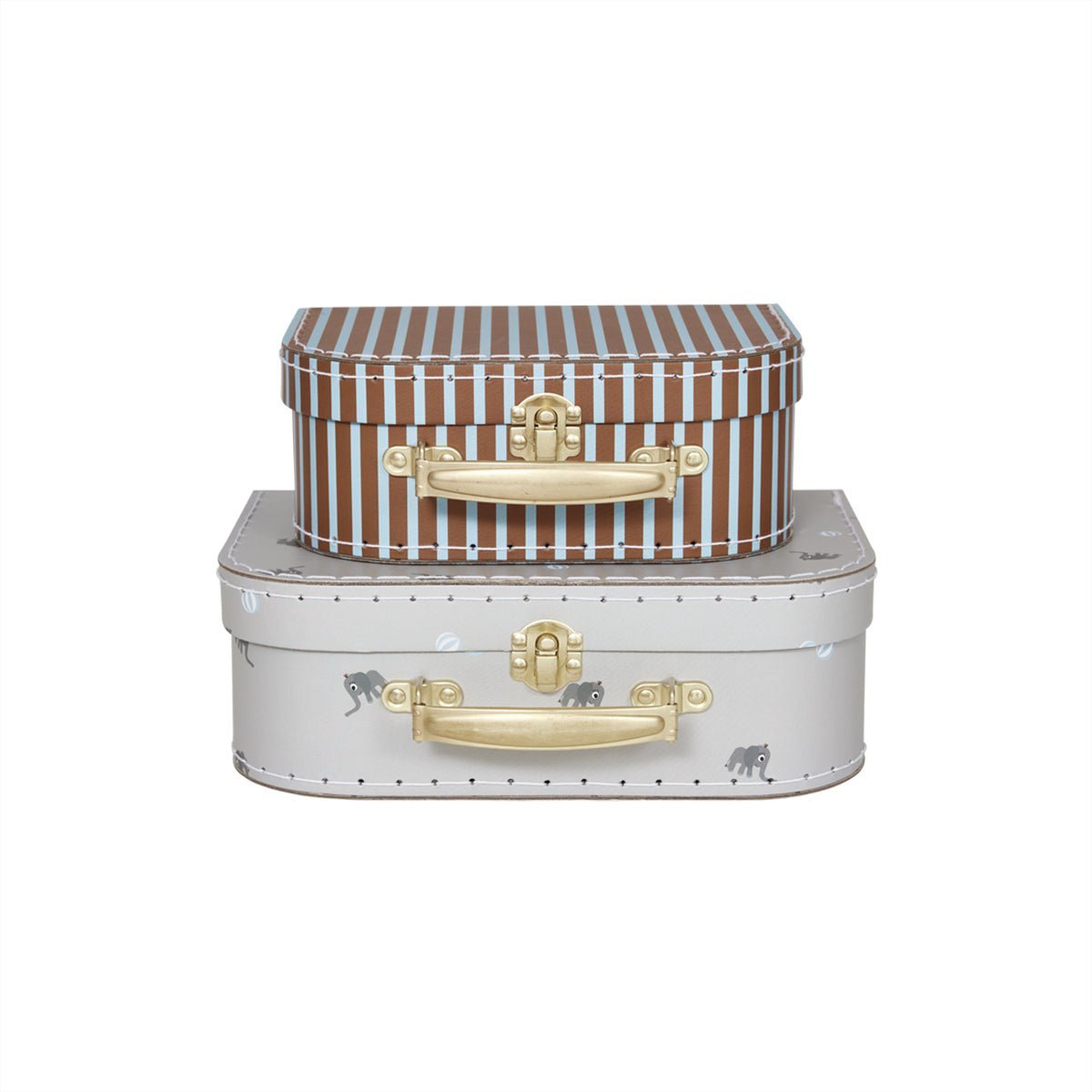 De set bestaat uit twee koffers in verschillende maten, beide gemaakt van stevig karton en versierd met een schattige print die elke kamer een speelse uitstraling geeft. Praktisch én decoratief – ideaal voor zowel opbergen als fantasierijk spel.