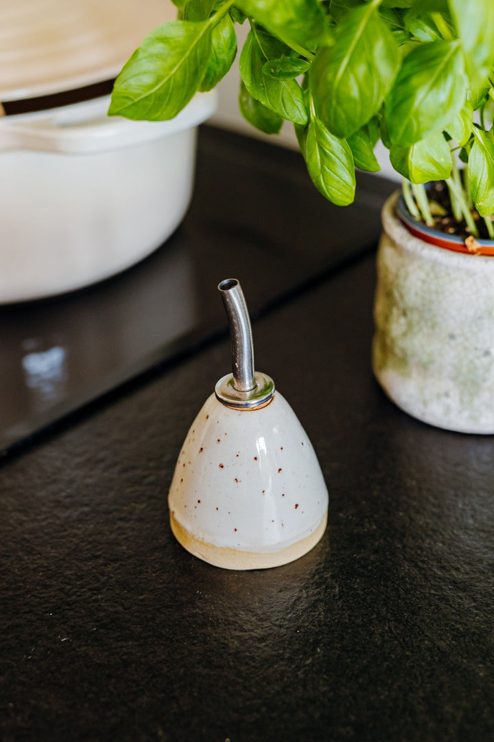 Handgevormd olijfflesje van steengoed, perfect voor olie, azijn of dressing. Slank, functioneel en met een zachte matte glazuur afgewerkt. Uniek in vorm, gemaakt om makkelijk te schenken zonder te morsen. Een stijlvolle toevoeging aan je tafel of keuken.