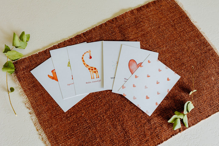 Een verfijnde set postkaarten met zachte lijnen, kleine quotes en eenvoudige tekeningen.
