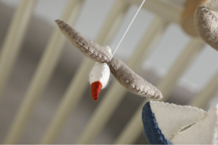 Breng de rust van de zee in de babykamer met onze handgemaakte maritieme mobiel. Deze unieke babykamer decoratie met zeilboten en meeuwen zorgt voor een kalme en speelse sfeer boven het wiegje of de commode. Gemaakt van zachte, duurzame materialen en met liefde afgewerkt, is elke mobiel een klein kunstwerk.