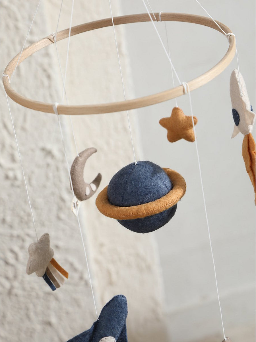 Laat je kleintje wegdromen tussen de sterren met onze handgemaakte ruimte mobiel. Deze unieke babykamer decoratie brengt het heelal tot leven boven het wiegje of de commode. Gemaakt van zachte, duurzame materialen en met oog voor detail, is dit een echte blikvanger in de kinderkamer.