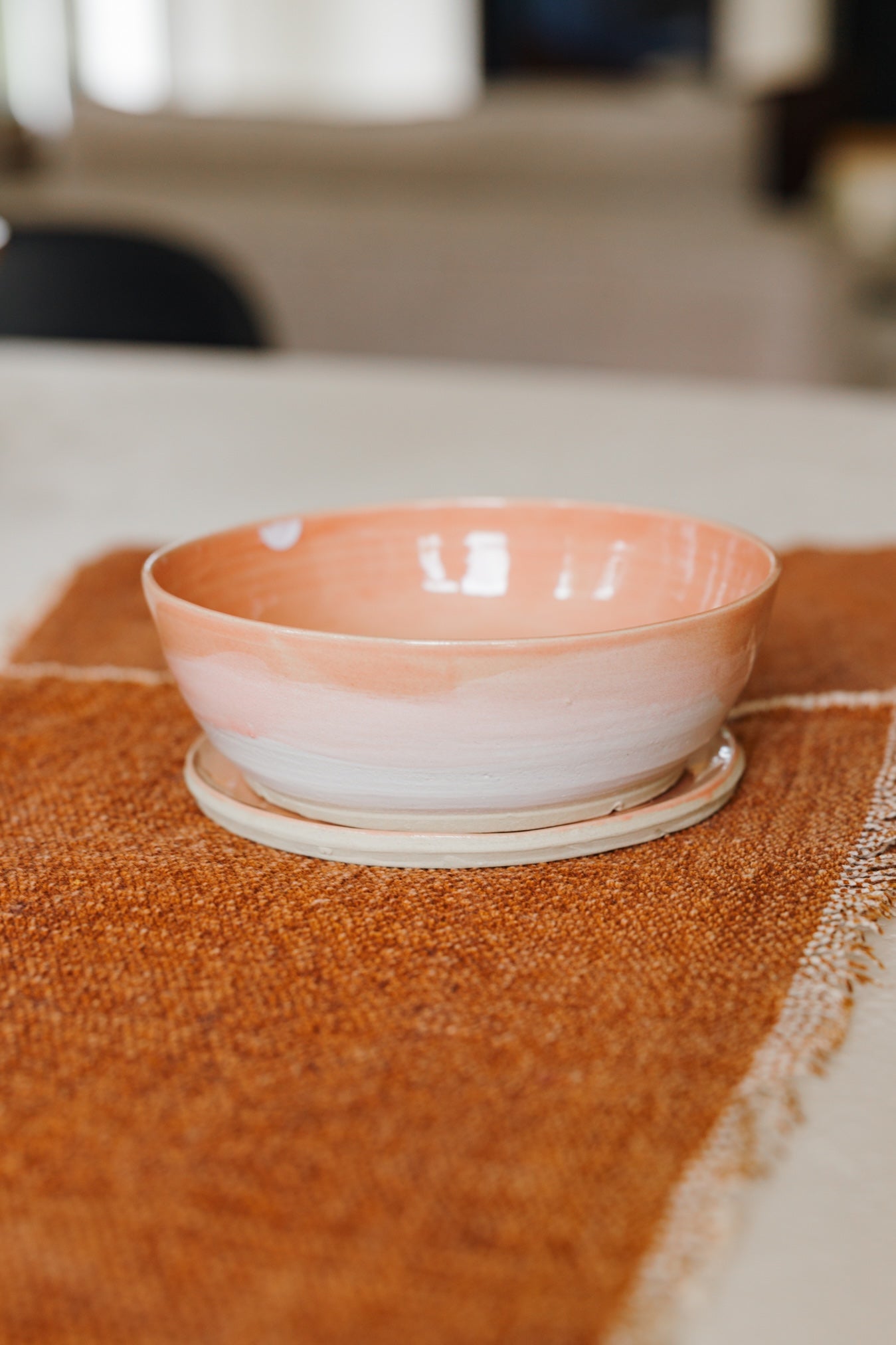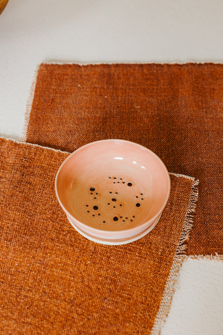 Met de hand gevormd in een zachte roze glazuur. Ideaal voor het wassen en serveren van bessen, druiven of kleine groente. Subtiele perforaties, een rustige vorm, functioneel én decoratief. Een liefdevol detail op aanrecht of tafel.