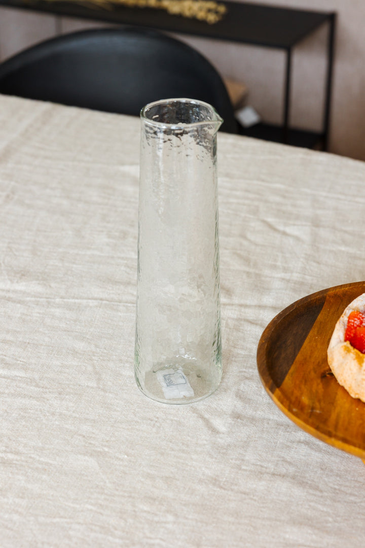 Een slanke karaf van helder glas, ontworpen met oog voor eenvoud en verfijning.